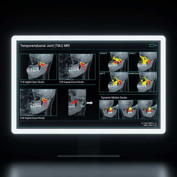 La RM de ATM es un examen no invasivo que visualiza el disco articular, el cóndilo mandibular, la fosa temporal y tejidos periarticulares. La técnica identifica desplazamiento discal (con o sin reducción), derrame, sinovitis, cambios degenerativos (artrosis) y lesión del ligamento posterior.