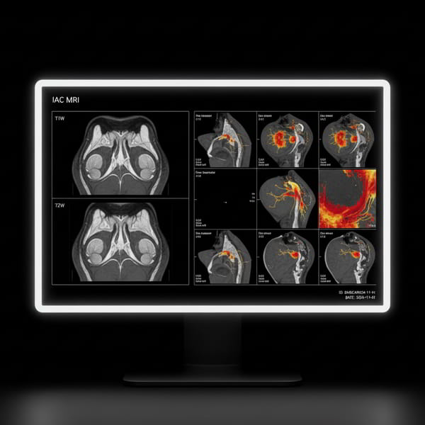El conducto auditivo interno (IAC) es un canal óseo que contiene los nervios facial (VII) y vestibulococlear (VIII) y vasos asociados. La RM del IAC evalúa nervios, laberinto membranoso, cóclea/vestíbulo, canales semicirculares y el ángulo pontocerebeloso para detectar tumores, inflamación o compresiones.