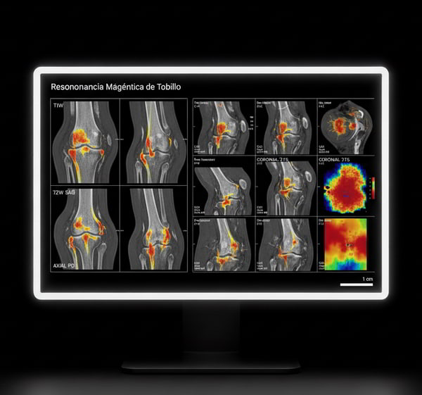 La resonancia de tobillo sirve para confirmar esguinces o roturas, detectar tendinopatías (p. ej., Aquiles, peroneos, tibial posterior), evaluar cartílago y edema óseo, y guiar el plan de rehabilitación o cirugía.